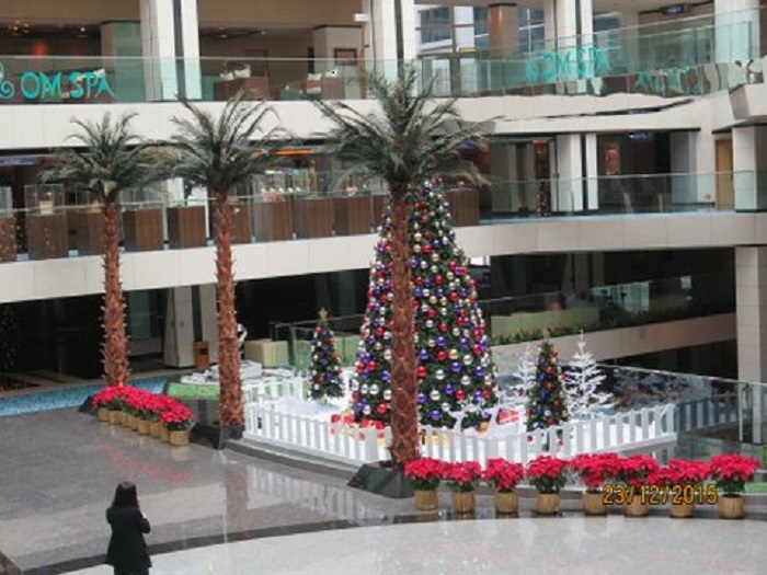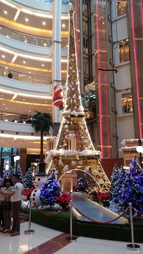 It started with the multi-storied Christmas tree in our airport hotel. The closest comparison that came to mind was Neiman-Marcus in downtown San Francisco with a gigantic frosted tree filling its Victorian atrium. Well, a tree is one thing, but what to make of surrounding scenes of snow-covered houses, twinkling lights, colored balls—and Santas everywhere. And, of course, sales. What to think of the endless American Christmas music, 50s-style, with long-dead crooners throbbing from every loud-speaker: “I’m Dreaming of a White Christmas,” “Frosty the Snowman,” “Have Yourself a Merry Little Christmas,” and of course “Rudolph”?