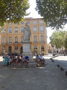 At the other extreme is the fountain at the base of the statue of the “Good King,” Roi Réné, who stands as protector of his city at one end of its main, wide boulevard, the Cours Mirabeau. Among other things, Réné was a poet who enjoyed poetic sparring with his famous cousin, the Duke Charles d’Orléans, himself a renowned poet. One of Charles’ celebrated poems, Je Meurs de Soif Auprès de la Fontaine (“I Die of Thirst next to the Fountain”) perhaps finds new meaning here. Hot and thirsty citizens sit under a sparing shade at its bone-dry edge.